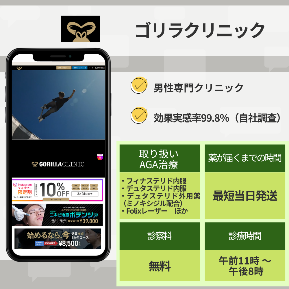 ゴリラクリニック | 11:00 〜 20:00 ※不定休 | 診察料:無料 送料:1万円以上で無料 | 対面・オンライン再診に対応 血液検査で安全性を確認 効果がない場合は全額返金保証あり |