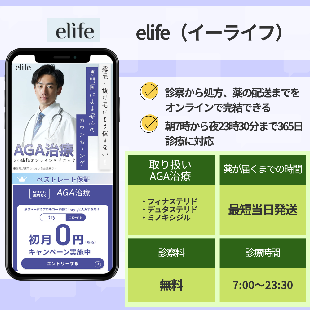 elife | 7:00〜23:30(365日対応) | 診察料:無料 送料:無料 | LINE・メール相談対応 オンライン再診で処方調整可能 必要時は提携クリニックへ紹介 |