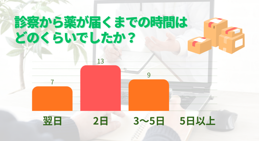 また、実際に診察から薬が届くまでの時間はどのくらいだったのかということについてもアンケートで確認しました。