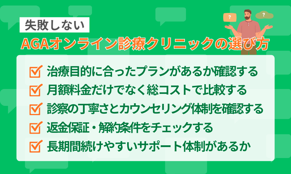 この記事では、AGAオンライン診療がおすすめなクリニックをさまざまな観点から比較してご紹介しました。