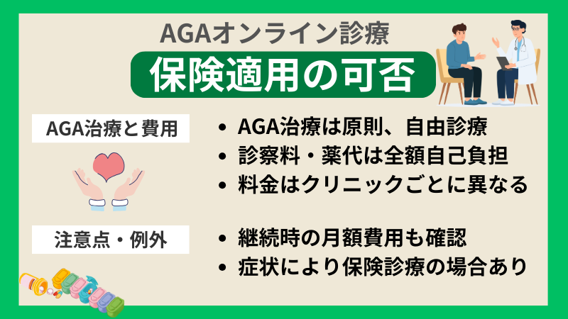AGAの治療は、オンライン診療・対面診療のいずれの場合も、基本的に保険適用外(自由診療)として扱われます。