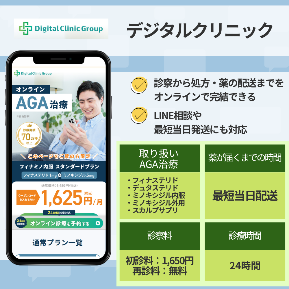 デジタルクリニック | 24時間365日対応 | 初診料:1,650円 再診料:無料 送料:全国一律 550円 | オンライン再診あり チャット・LINE相談可 副作用時は処方調整対応可 |