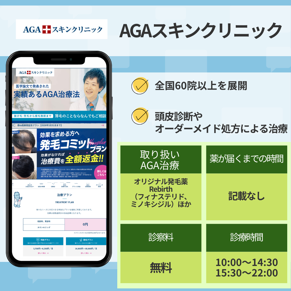 AGAスキンクリニック | 10:00~14:30 15:30~22:00 ※年中無休 | 診察料:無料 送料:無料(マイページ依頼の場合)/着払い(電話依頼の場合) | 定期再診で経過確認 写真・血液検査で治療状況を確認 電話・LINE相談可能 |