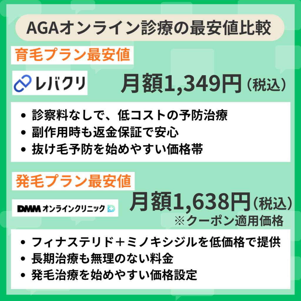- 発毛プランなら、12ヶ月定期で月1,638円(税込)のDMMオンラインクリニックがおすすめ