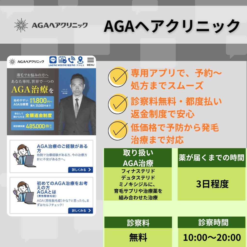AGAヘアクリニック | 10:00〜20:00 | 診察料:無料 送料:全国一律 520円 | 全額返金保証制度あり (1年継続・月1回通院が条件) |