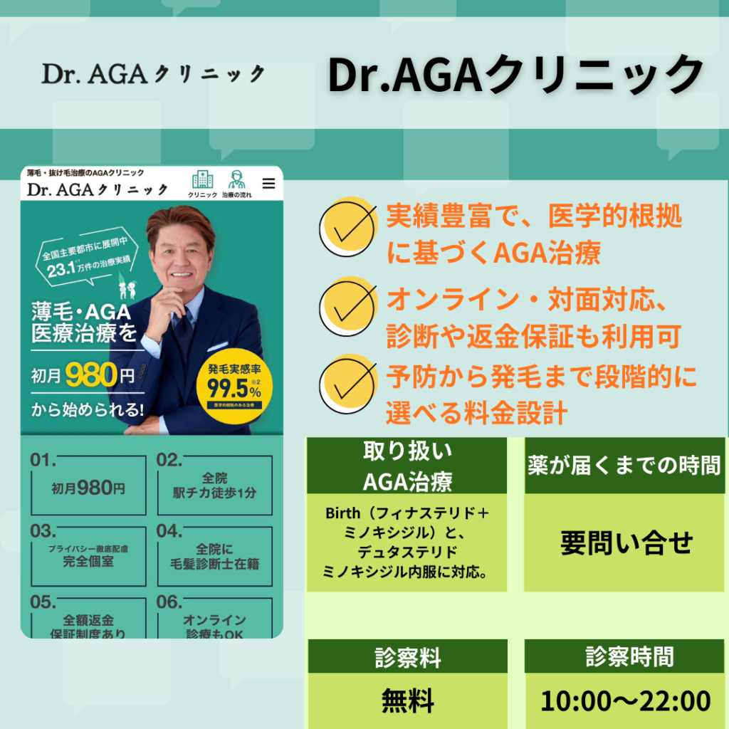Dr.AGAクリニック | 10:00〜22:00 | 診察料:無料 受診医院より着払い発送 | 全額返金保証制度あり (月1回の通院・写真撮影・マイクロスコープ診断が条件) |