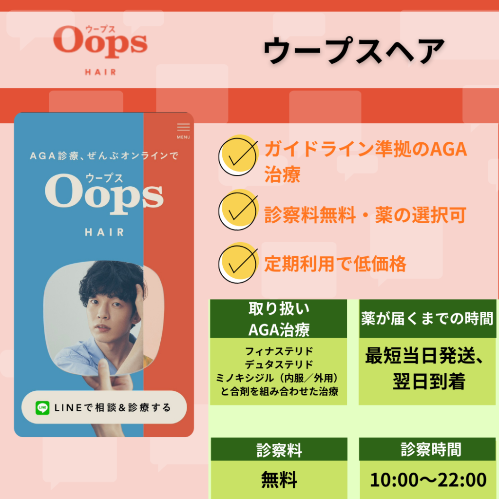 ![]() Oops HAIR(ウープスヘア) | 10:00~22:00 土日も診療 | 診察料:無料 送料:全国一律 550円 | 6ヶ月ごとの再診を推奨 |