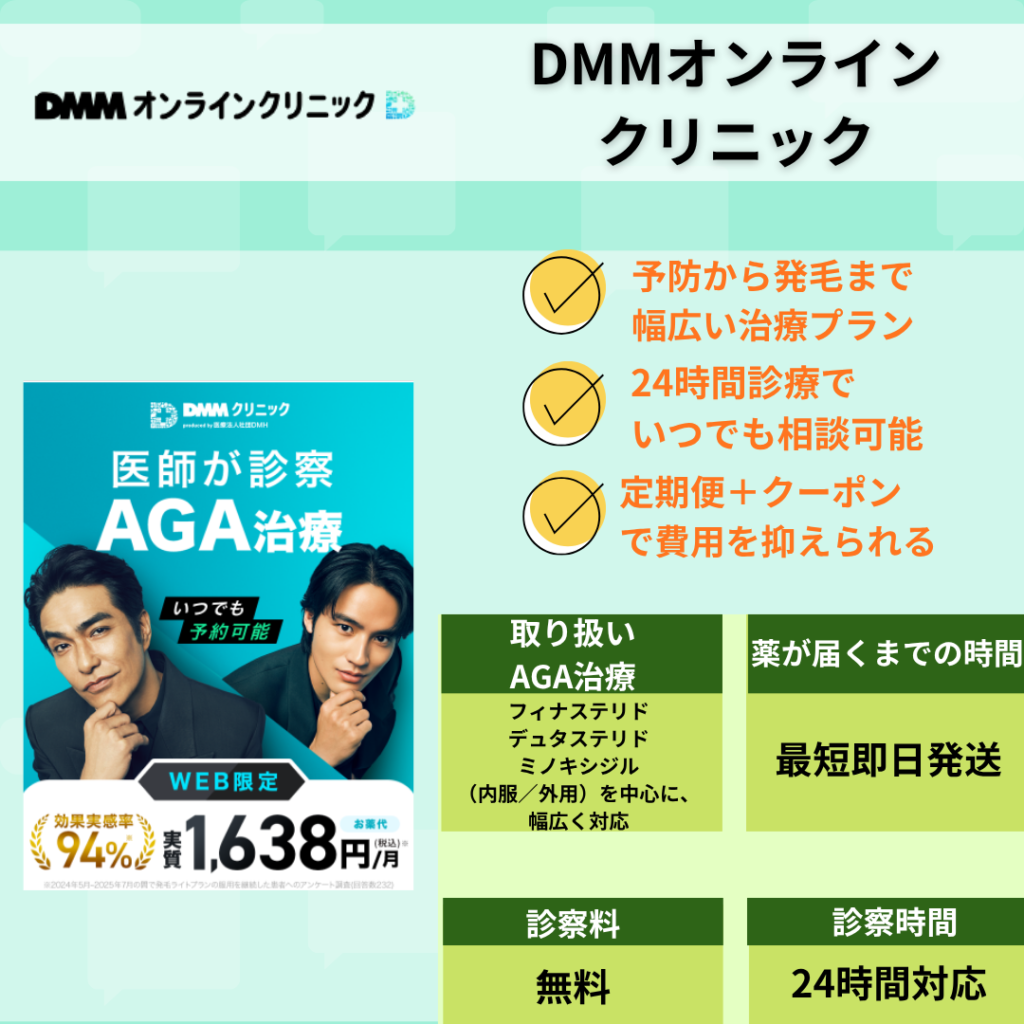 → DMMオンラインクリニック(発毛プランが月額1,638円(税込)※始めやすい)
