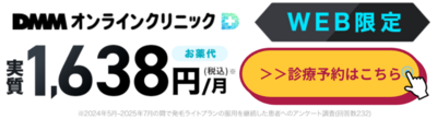 DMMオンラインクリニック | 24時間 ※年末年始を除く | 診察料:無料 送料:全国一律 550円 | 診療後も医師・薬剤師に相談可能 |