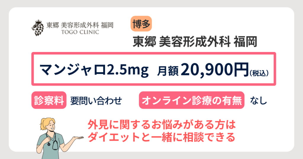 博多でマンジャロを取り扱っているクリニックは、対面診療では東郷 美容形成外科 福岡です。