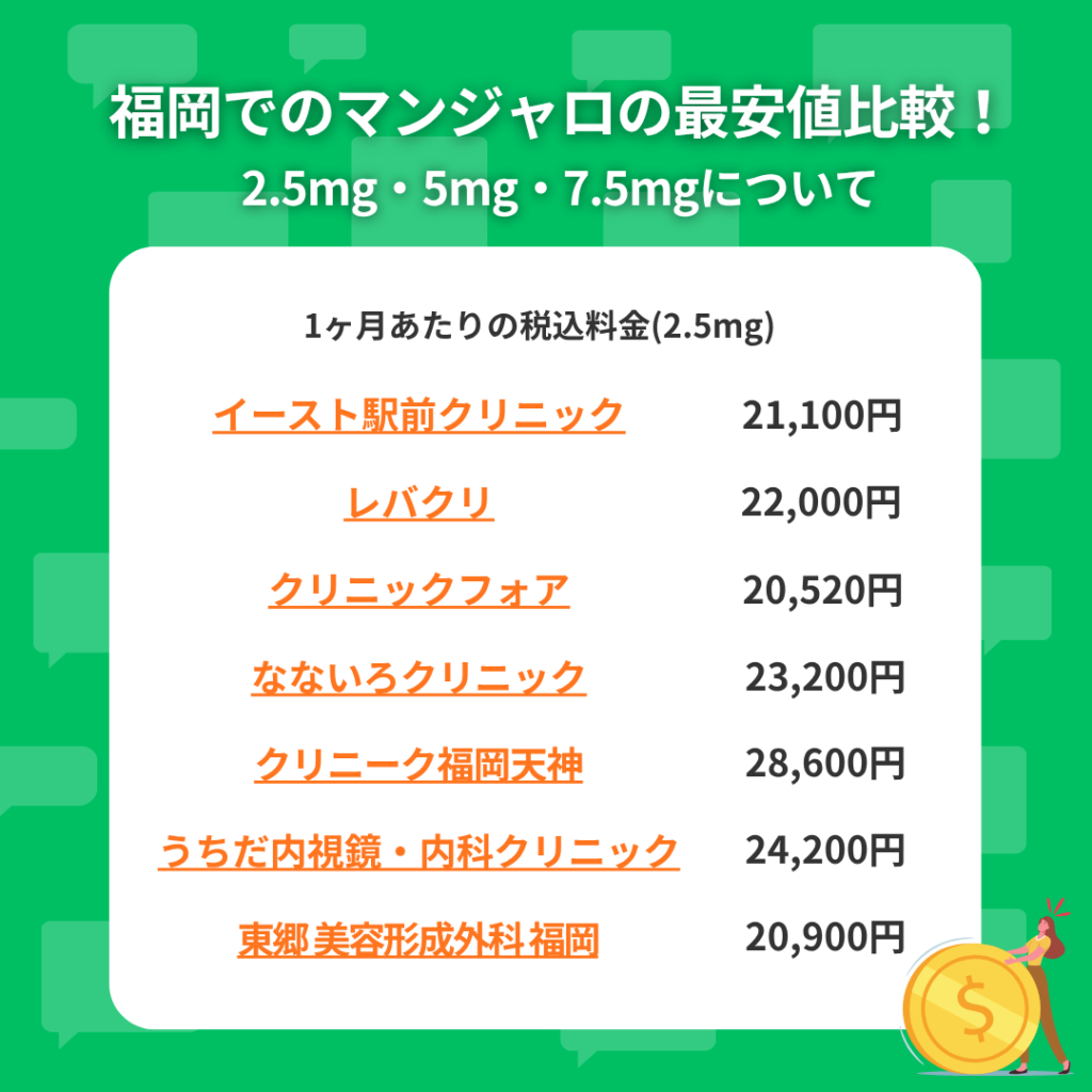マンジャロの各規格(2.5mg・5mg・7.5mg)の各クリニックの値段を表にまとめ福岡での最安値をご紹介しています。
