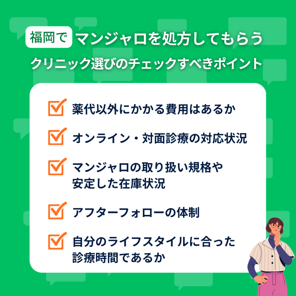 福岡でマンジャロを処方しているクリニックを選ぶ際に、確認すべきポイントをまとめました。