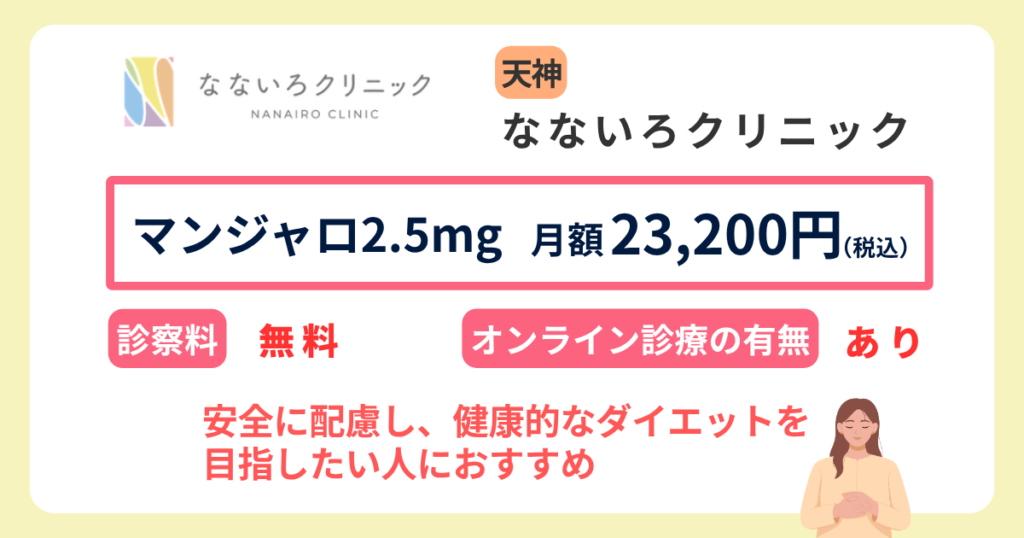 福岡の天神駅から徒歩5分の場所にクリニーク福岡天神、徒歩6分の場所になないろクリニックがあり、マンジャロの処方が可能です。駅チカのクリニックをお探しの方は参考にしてください。