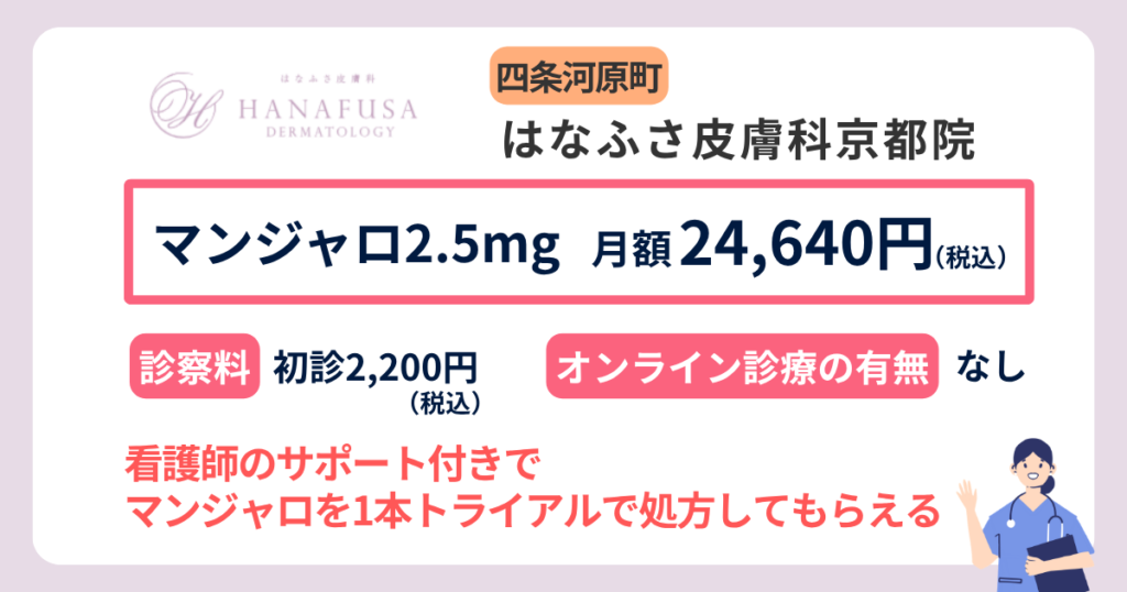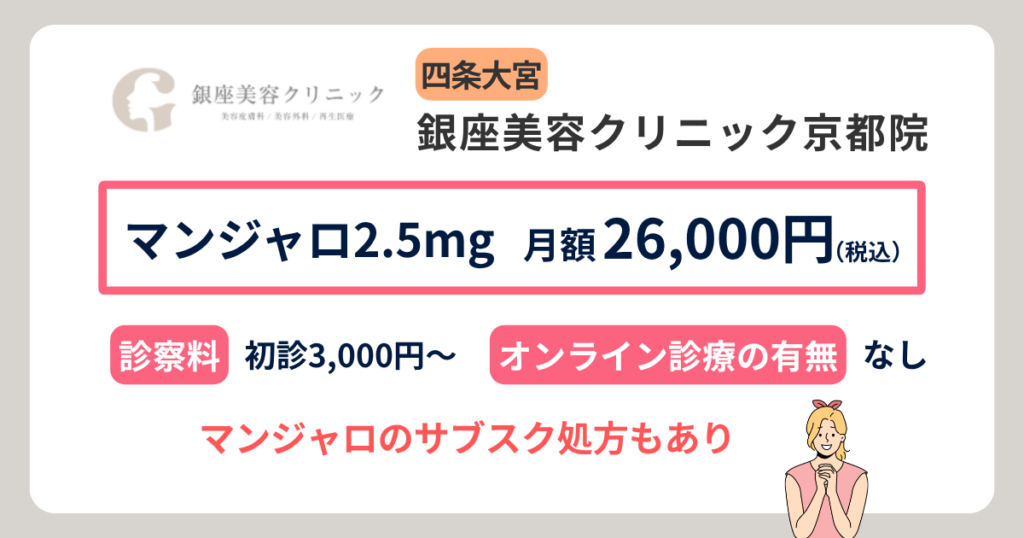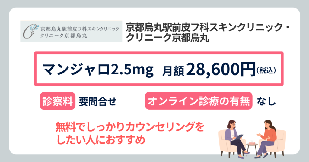 京都烏丸駅前皮フ科スキンクリニック・クリニーク京都烏丸では、マンジャロ2.5mgを4本28,600円(税込)で処方しています。
