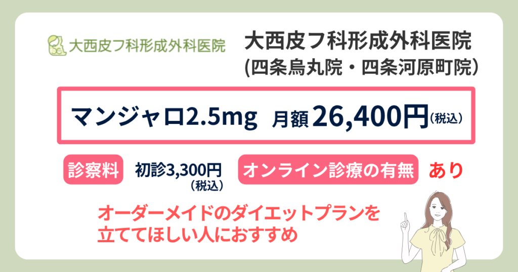 大西皮フ科形成外科医院では、マンジャロ2.5mgを4本で26,400円(税込)で処方しています。