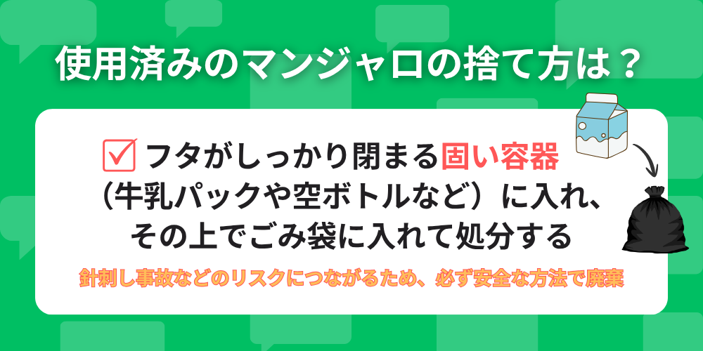 使用済みのマンジャロは、注射針が内部に収納される構造ですが、医療用の鋭利な器具にあたるため、安全に配慮して廃棄する必要があります。