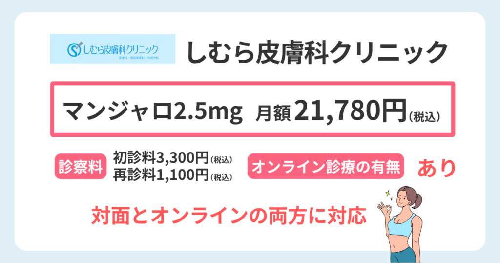 しむら皮膚科クリニック | 22,000円 | オンライン診療予約料:1,100円 | 23,100円 ※オンライン診療の場合 |