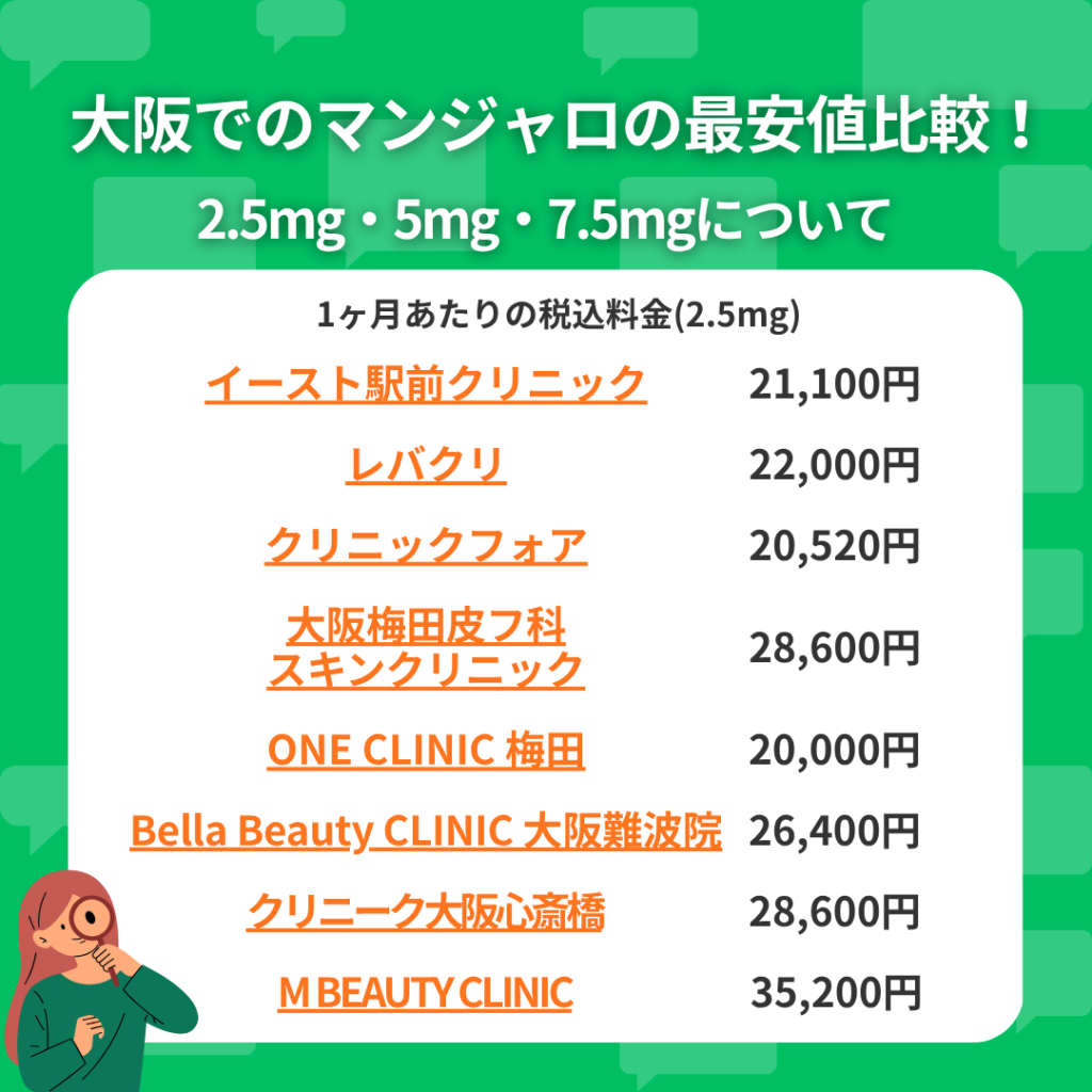 大阪でマンジャロを処方しているクリニックは複数あり、料金やプラン内容はそれぞれ異なります。