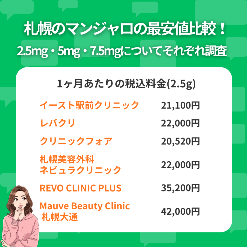札幌でマンジャロを処方しているクリニックの料金を、2.5mg・5mg・7.5mgごとに比較しました。