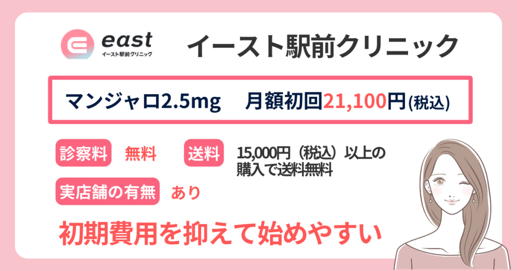 - マンジャロ2.5mgを安く始めたいなら:イースト駅前クリニック(初回 21,100円(税込)〜)